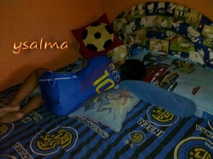 Perhatikan photo dengan seksama 🙄 . Setelah melakukan tendangan pojok, dengan menyudutkan bola berwarna merah, kuning, hitam, putih,(bantal-bantal  berbentuk bola 😉 ). Akhirnya Messi terkapar di kasur Inter! (bed cover). Dengan diantar Lightning MC Queen dan kawan-kawan dari The Cars Team (bantal untuk kepala), serta dikawal dengan ketat oleh pasukan super hero Justice League (bantal segiempat dipunggung), Messi tertangani dengan baik di alam mimpinya 😆 .