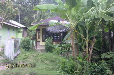 Foto di atas adalah tampak depan rumah hijau masa kecil yang sudah tampak tua (usianya sudah 32th-an lebih). Dulu di sebelah pokok pohon pisang, ada pohon belimbing wuluh yang dimanfaatkan untuk bumbu sayur. Dari pokok belimbing hingga pintu pagar ada pagar hidup dari pokok bunga kembang sepatu yang terawat rapi.