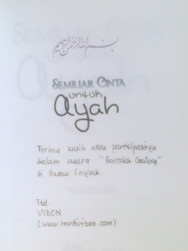 Kebetulan, YSalma terpilih menjadi salah dua dari 11 top  komen tamu yang mendapatkan sebuah souvenir berupa sebuah buku, “Semiliar Cinta untuk Ayah“.
