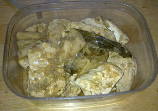 - Masukkan ke wadah memasak ( panci ), air kelapa, lengkuas, daun salam, asam jawa dan bumbu halus. Aduk sampai semua bahan tercampur.