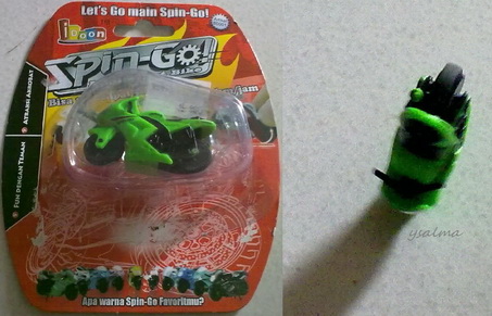 Spin Go adalah mainan motor mini (seukuran jempol tangan) tanpa baterai. Memainkannya dengan cara memutarkan roda belakang ke lantai (spin) kemudian lepas (Go). Motor mini ini bisa jungkir balik, berputar dengan bertumpu pada roda depannya. Bagi anak-anak permainan ini seru sepertinya 😳 .