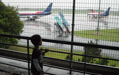 Weekly Photo Challenge: Two Subjects yang ysalma punya. Latar depannya (anak ) agak gelap, latar belakangnya (pesawat)  agak terang :mrgreen: .